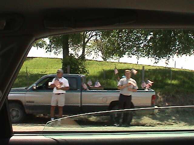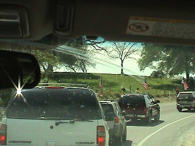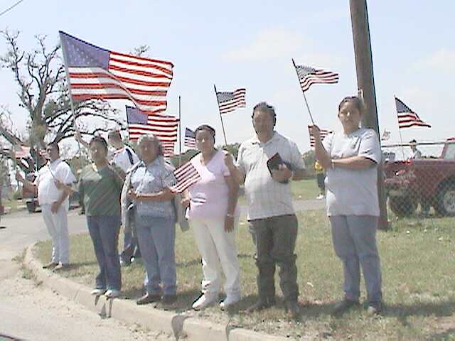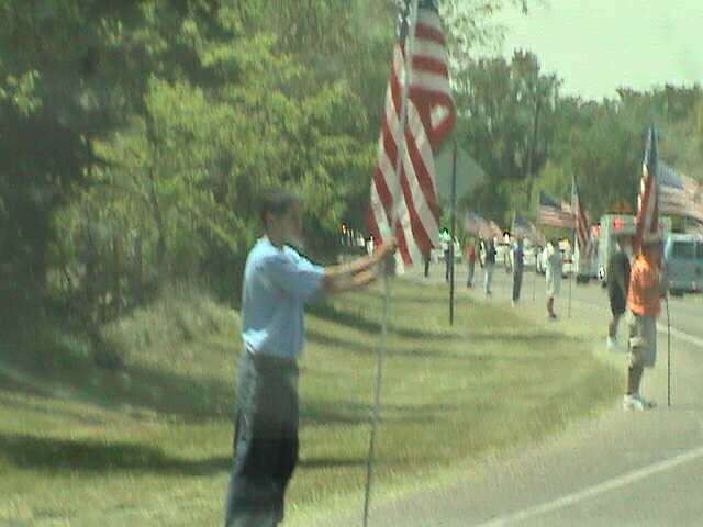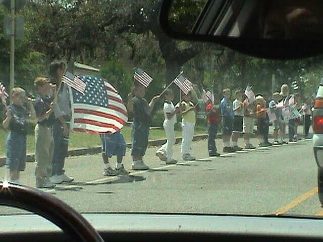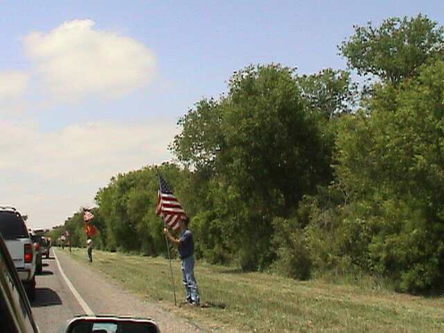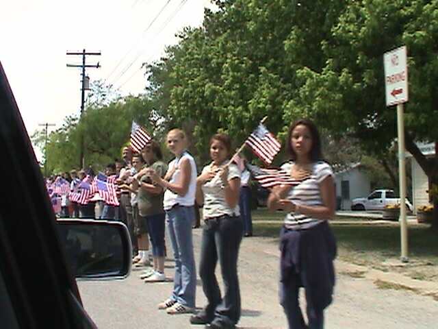 (he was serving our country in Iraq): "I'm back, it was certainly a quick trip, but I have to also say it was one of the most amazing experiences of my life. There is a lot to be said for growing up in a small town in sprays, a portrait of James, his uniform and boots, his awards and ribbons. There was lots of military brass and an eloquent (though inappropriately longwinded) Baptist preacher. There were easily 1000 people at the service, filling the church sanctuary as well as the fellowship hall and spilling out into the parking lot. However, the most incredible thing was what happened following the service on the way to the cemetery. We went to our cars and drove to the cemetery escorted by at least 10 police cars with lights flashing and some other emergency vehicles, with pulled over, got out of their cars, and stood silently and respectfully, some put their hands over their hearts. When we turned off the highway suddenly there were teenage boys along both sides of the street about every 20 feet or so, all holding large American flags on long flag poles, and again with their hands on their hearts. We thought at first it was the Boy Scouts or 4H club or something, but it continued .... for two and a half miles. Hundreds of young people, standing silently on the side of the road with flags. At one point we passed an elementary school, and all the children were outside, shoulder to shoulder holding flags .. kindergartners, handicapped, teachers, staff, everyone. Some held signs of love and support. Then came teenage girls and younger boys, all holding flags. Then adults. Then families. All standing silently on the side of the road. No one spoke, not even the very young children. The military presence..at least two generals, a fist full of colonels, and representatives from every branch of the service, plus the color guard which attended James, and some who served with him ... was very impressive and respectful, but the love and pride from this community who had lost one of their own was the most amazing thing I've ever been privileged to witness.